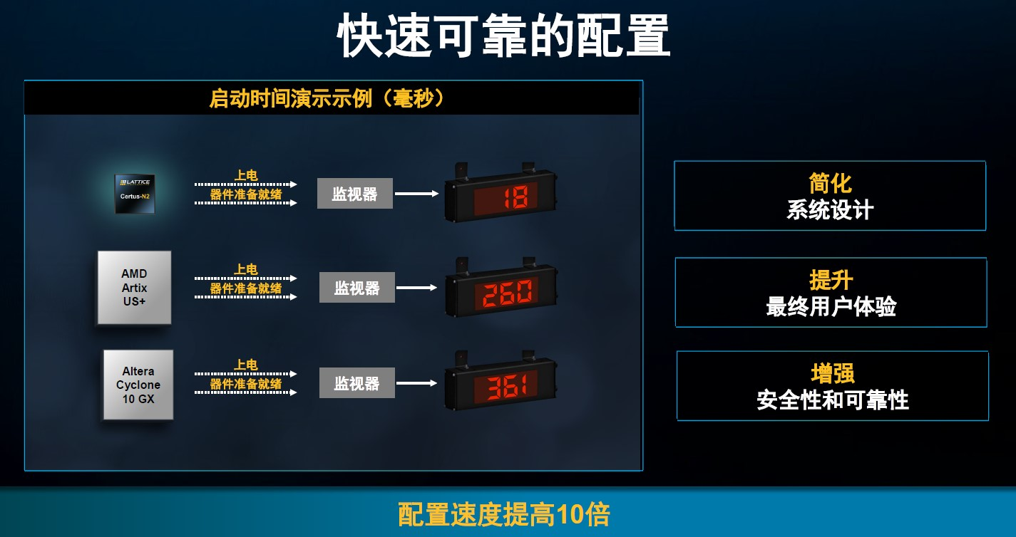 这样的特性在实际应用中是备受青睐的。以工业生产安全为例,考虑到在出现故障时,系统必须具备在瞬间恢复工作的能力,那么启动速度就十分重要。下图对比了外部闪存配置速度,具体的时间值是从INIT有效到DONE信号引脚有效的时间。测试结果显示,Certus-N2相比另外两款竞品快出15-20倍。