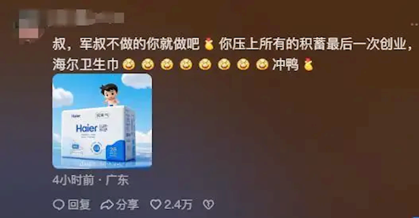 更有网友建议海尔推出卫生巾、纸尿裤、安心裤、湿纸巾等产品,甚至连产品外包装都设计好了,并表示“雷军不做的话你来做吧!”