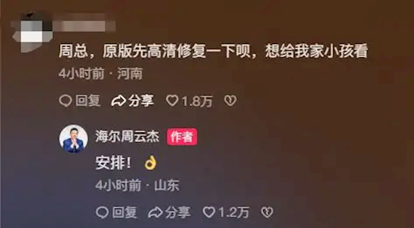 还有人许愿想要海尔兄弟的高清原版动画,给孩子看,周云杰也爽快答应;