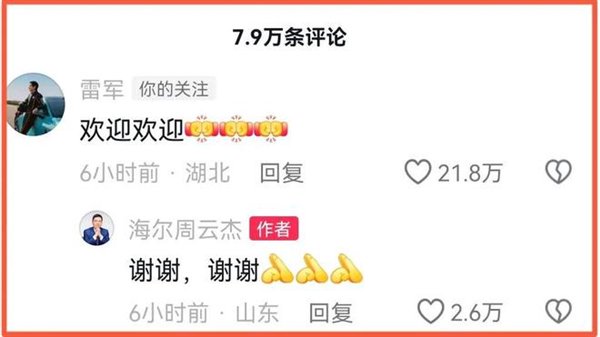 对于周云杰入驻抖音,他的“恩师”雷军在评论区留言表示欢迎,周云杰也热情回应。
