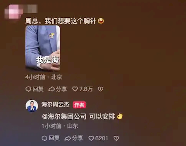 有的许愿想要周云杰出镜时佩戴的胸针,周云杰随即@海尔集团公司表示可以安排;
