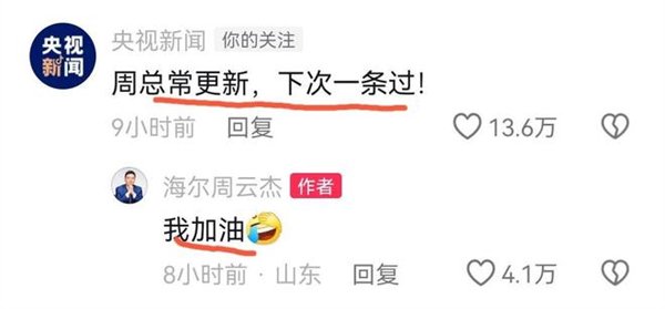 更令人惊讶的是,央视新闻也在周云杰的视频评论区罕见发声,鼓励他常更新,并开玩笑说拍视频要“一条过”。这样的待遇引发了网友们的疯狂点赞。