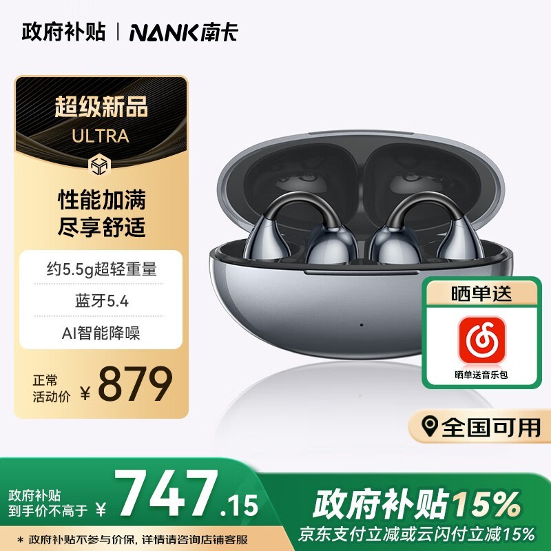 南卡Ultra耳夹式蓝牙耳机幻影黑优惠价713元