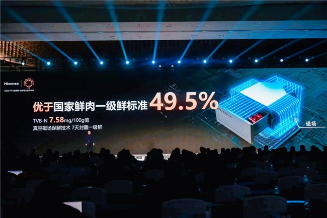 另一方面,该冰箱采用耦合磁场保鲜技术,通过磁致生物学效应,一方面促进水分子有序排列,另一方面降低酶分子活性,真正将保鲜深入到分子层面,实现7天一级鲜。实验数据显示,在真空磁场保鲜技术加持下,放置其中储存7天的鲜肉TVB-N值优于一级鲜肉国标。