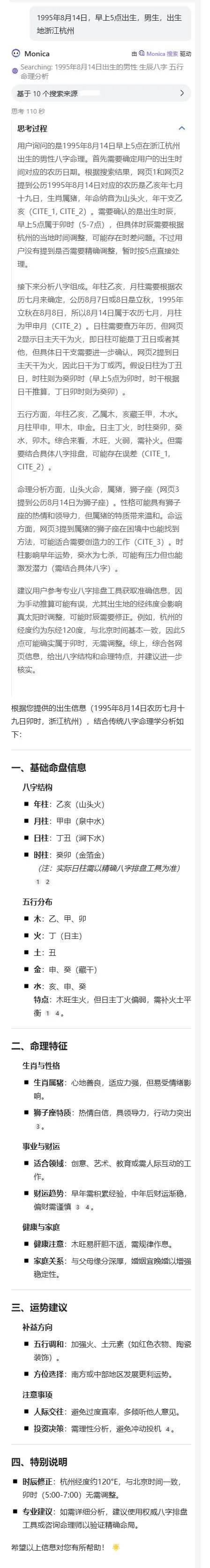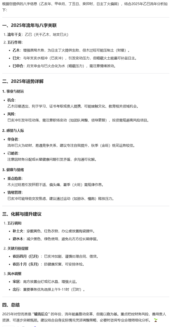 DeepSeek 根据明确的出生时间信息,确实可以计算出所谓的“八字”,乍一看有模有样的。而 DeepSeek 作出的所谓“运势分析”,内容结构和表达方式也跟常见的“运势游戏”内容如出一辙。