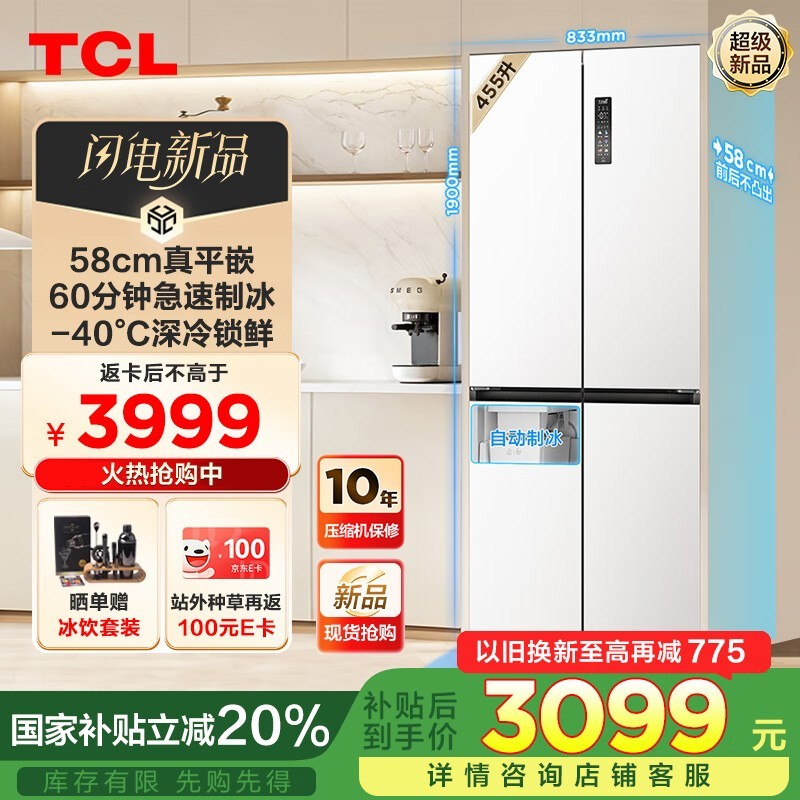 TCL455L风冷十字对开门冰箱促销到手价2511元
