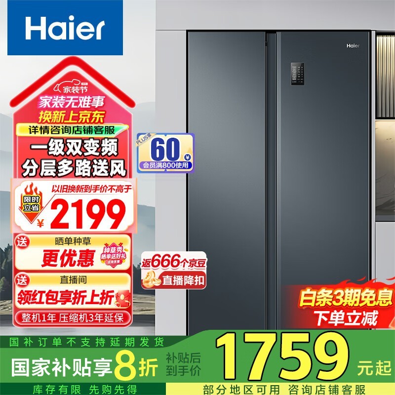 海尔532L风冷对开门冰箱优惠后仅1671元