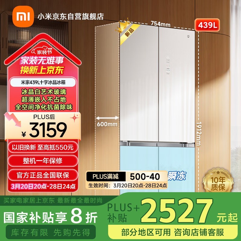 米家439L十字门冰箱 京东优惠低至2517元