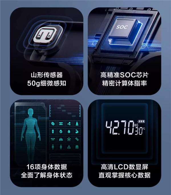 16项身体数据,全面了解身体状态。高精准SOC芯片,精密计算体脂率。高清LCD数显屏,直观掌握核心数据。