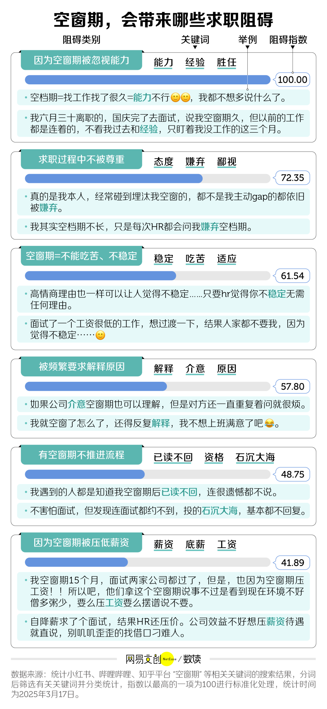 当然,最严重的后果还是求职路变得坎坷。很多人都提到自己面试时会遭遇求职单位的审问,仿佛空窗期有罪;还会质疑自己的能力,让人百口莫辩。