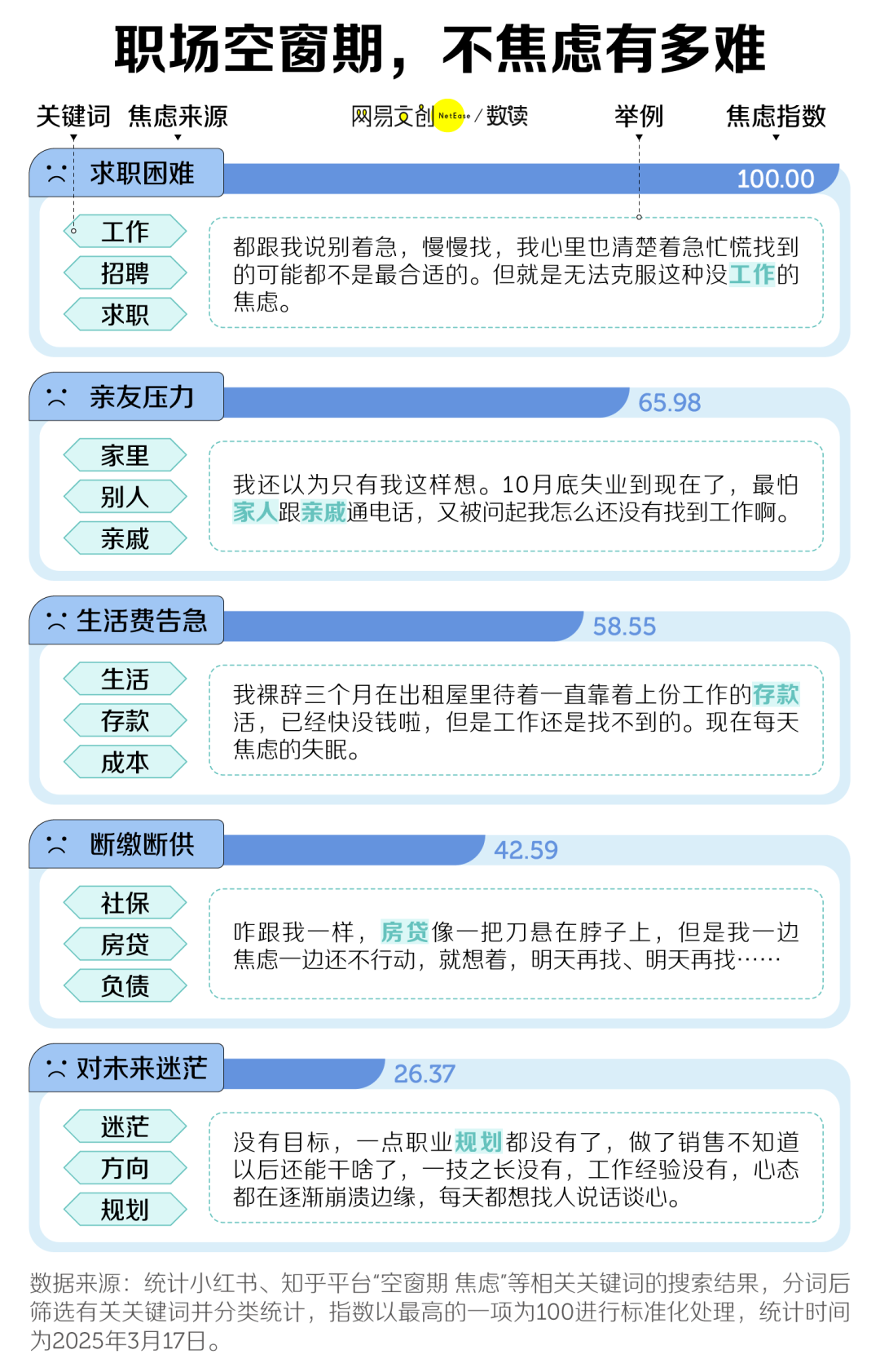 细看在职场空窗期内会让大家倍感焦虑的原因,会发现求职困难、亲友压力、生活费告急位列前三位。
