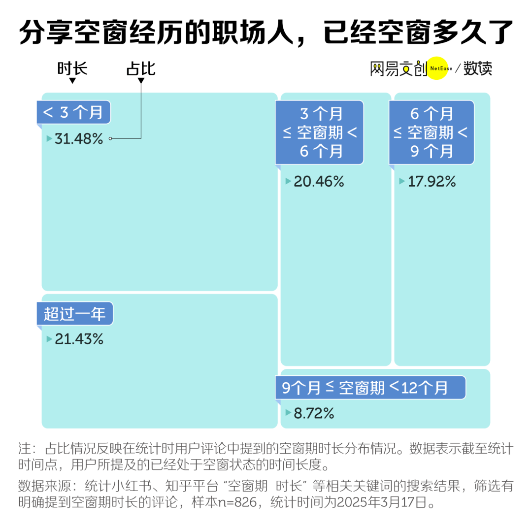 为了更好了解大家职场空窗期持续的情况,我们也对社交媒体上提及时长的讨论进行了统计,结果发现,职场空窗期较长的情况的确不算少见,像超过一年的占比就达到了21.4%。
