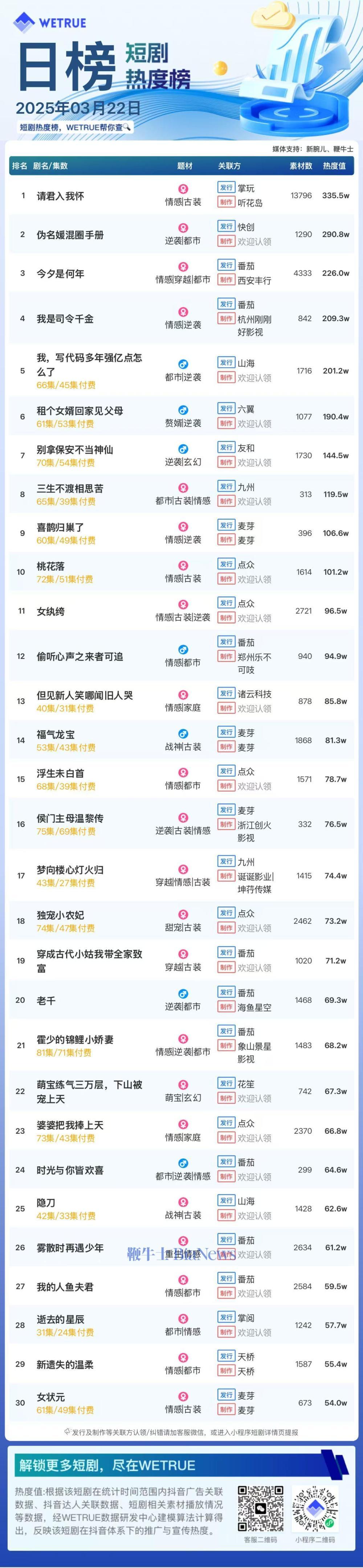 1、本日榜为WETRUE短剧数据公司提供,新腕儿和鞭牛士提供联合支持。