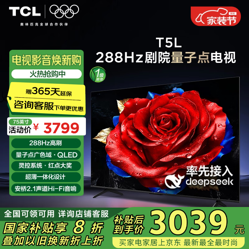 TCL 75T5L液晶电视4K超高清288Hz刷新率量子点