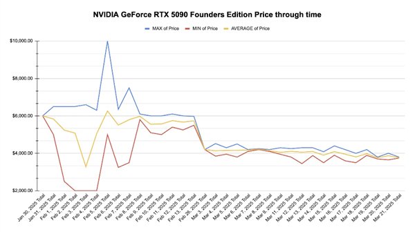 从数据来看,RTX 5090的价格在1月至2月初极为混乱,最高甚至被炒到10000美元,这主要是因为早期市场供应不稳定,导致价格波动极大。
