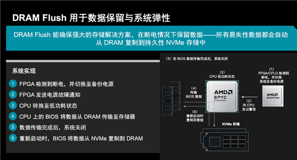 DRAM Flush可以在意外断电的时候,将所有易失性数据自动从DRAM内存中,复制到NVMe存储设备中,并在恢复供电后将数据重新重NVMe复制回DRAM,从而避免数据丢失。