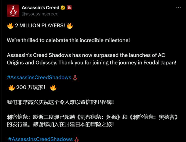这一成绩不仅较首日的100万玩家翻倍,还超越了前作《刺客信条:起源》和《刺客信条:奥德赛》的首发表现。