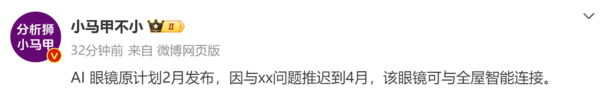 该博主发文称:“AI眼镜原计划2月发布,因与xx问题推迟到4月,该眼镜可与全屋智能连接。”虽然没点名是谁家的AI眼镜,但是考虑到其主要以爆料小米为主,因此该眼镜大概率是小米的AI眼镜。