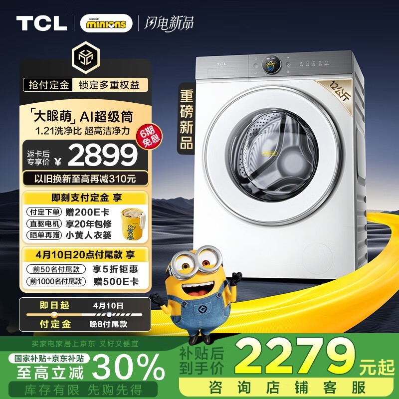 TCL小黄人12公斤滚筒洗衣机AI变频促销