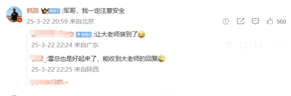 对此,雷军表示:“注意安全,一路顺风!”“军哥,我一定注意安全”韩路回复称。