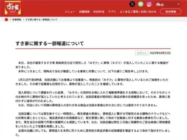 快科技3月23日消息,据报道,日本知名牛肉饭连锁店食其家(SUKIYA)近日陷入食品安全丑闻。 该公司在其官网发布声明,承认其门店提供的味噌汤中混入了老鼠尸体,并就此向公众道歉。