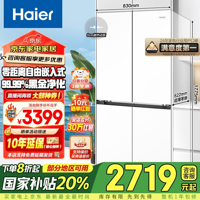 海尔Haier零距离嵌入十字四开门冰箱震撼促销