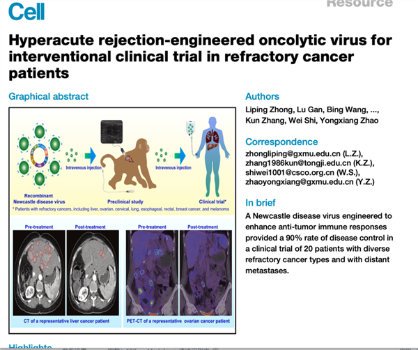 [1]Zhong L, Gan L, Wang B, et al. Hyperacute rejection-engineered oncolytic virus for interventional clinical trial in refractory cancer patients. Cell. 2025;188(4):1119-1136.e23.