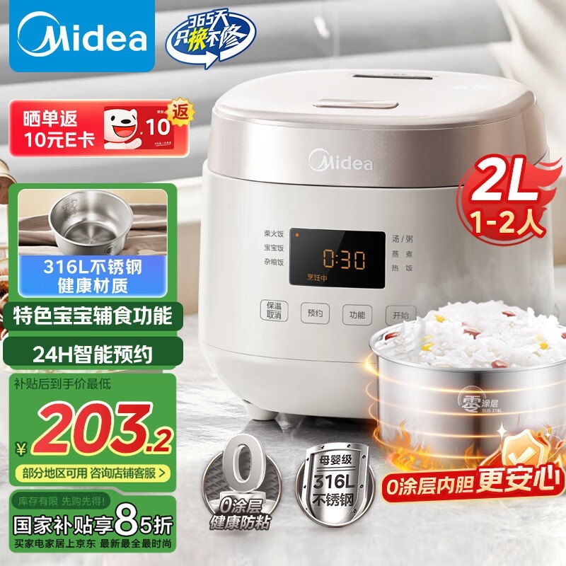 美的电饭煲MB-RC201S,2L不锈钢内胆,健康耐用仅158元