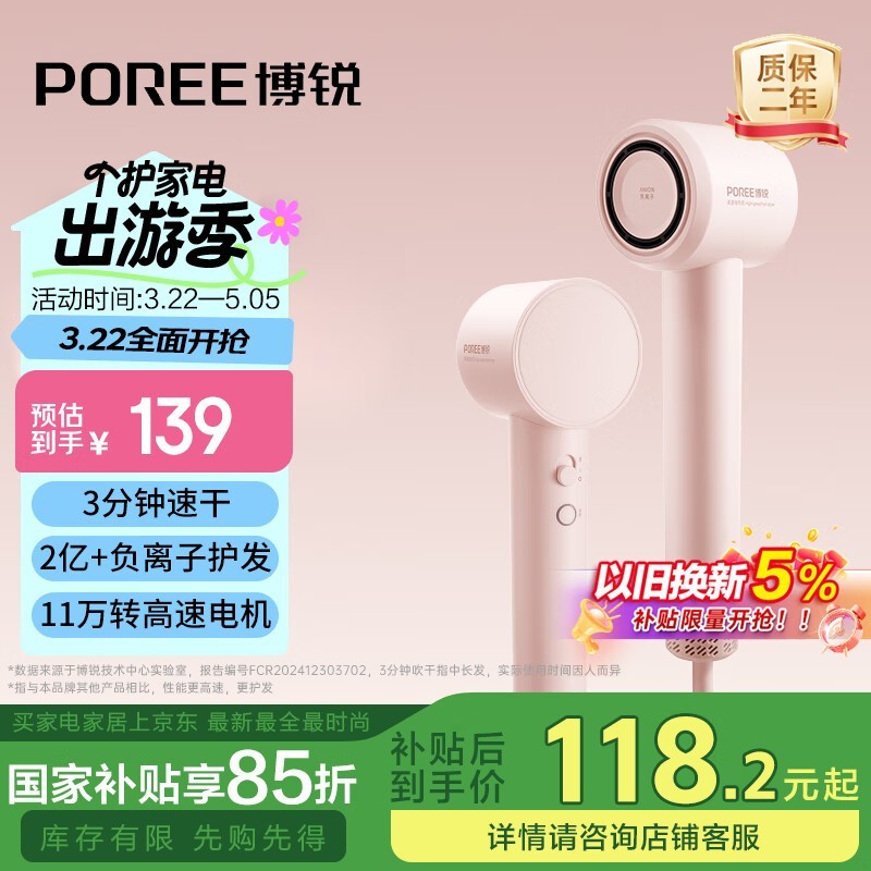 博锐电吹风粉色版大功率静音负离子护发京东好价