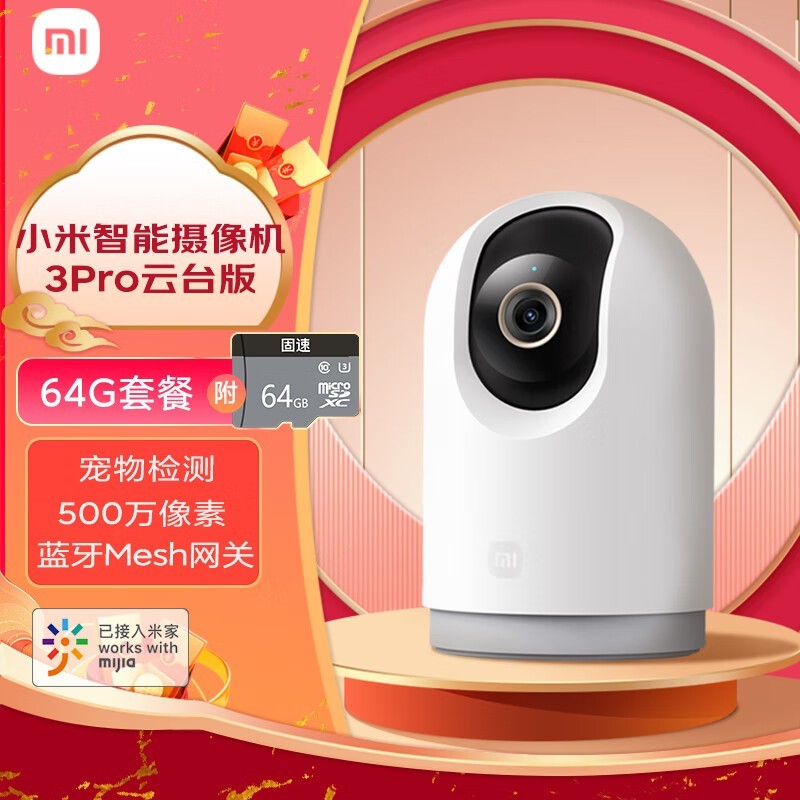 小米摄像头3Pro云台版+64G卡套装超清监控 lowes价格到手仅224元