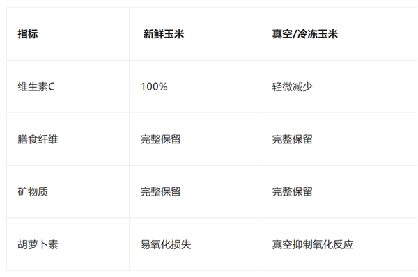 加工玉米的营养流失远低于大家的想象,真空包装甚至比常温存放3天的新鲜玉米更“有营养”: