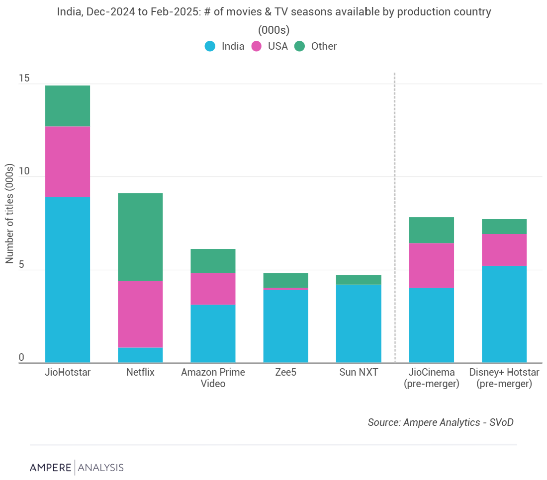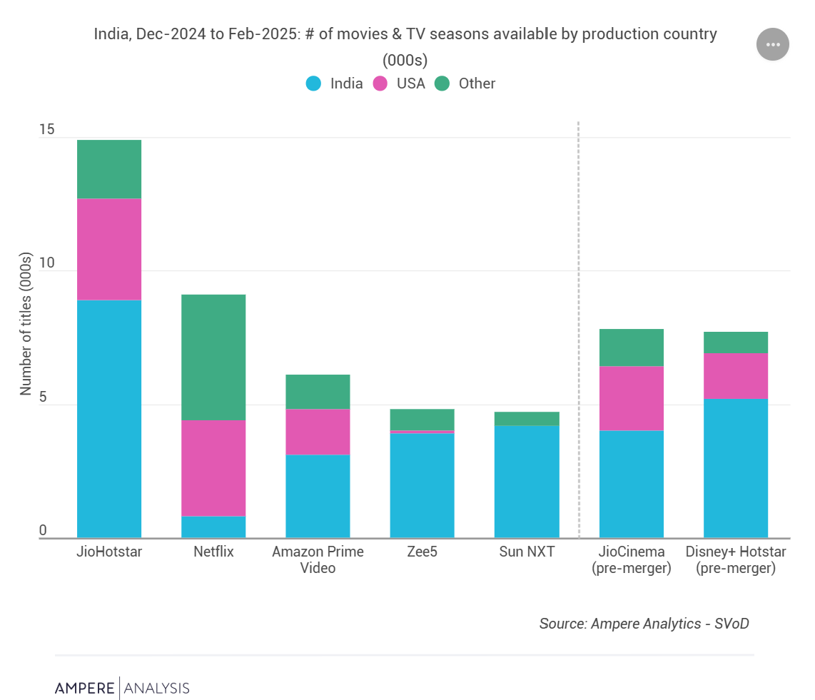 印度仍然是全球最具特色的主要订阅视频点播(SVoD)市场之一,因为众多本地或区域玩家的订阅用户数量超过了Netflix和亚马逊。随着Disney+ Hotstar和JioCinema合并为JioHotstar,印度SVoD市场出现了一个能够为用户提供大量受欢迎的本地内容以及来自多家美国主要工作室的内容。Ampere的SVoD内容库跟踪显示,合并后的实体在内容提供方面非常强大。