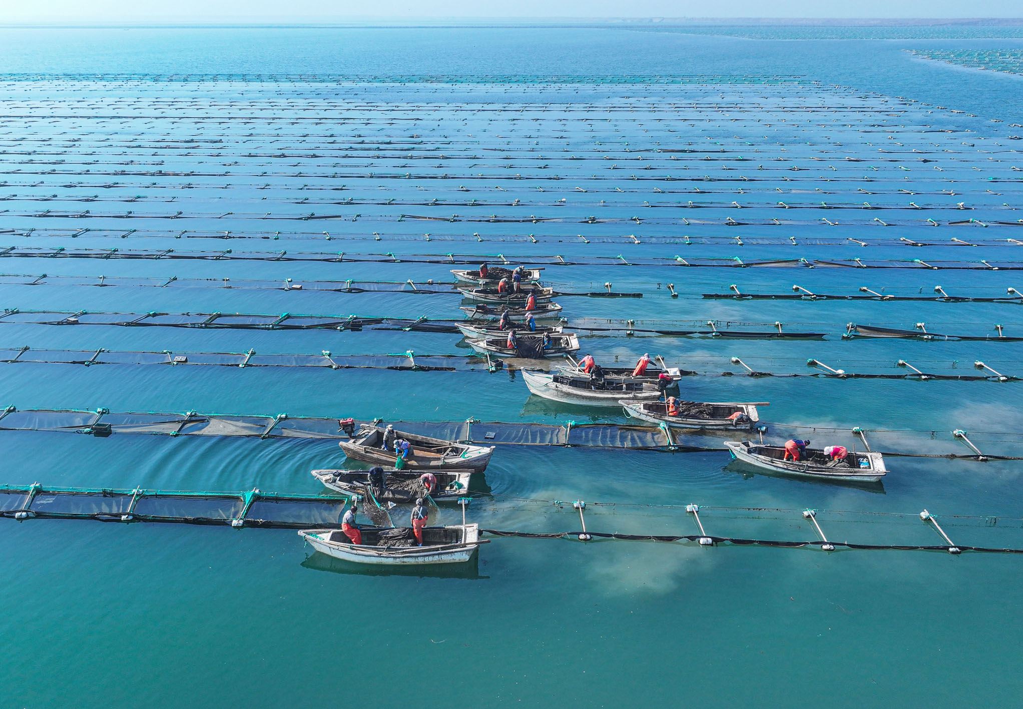 图为在山东省荣成市天海湾海洋牧场海参养殖区,渔民们驾驶渔船开展海参苗管护作业。目前,荣成市海参养殖面积近23万亩,年产值超60亿元,海参养殖已成为当地渔业增效、渔民增收的支柱产业之一。 新华社发(李信君 摄)