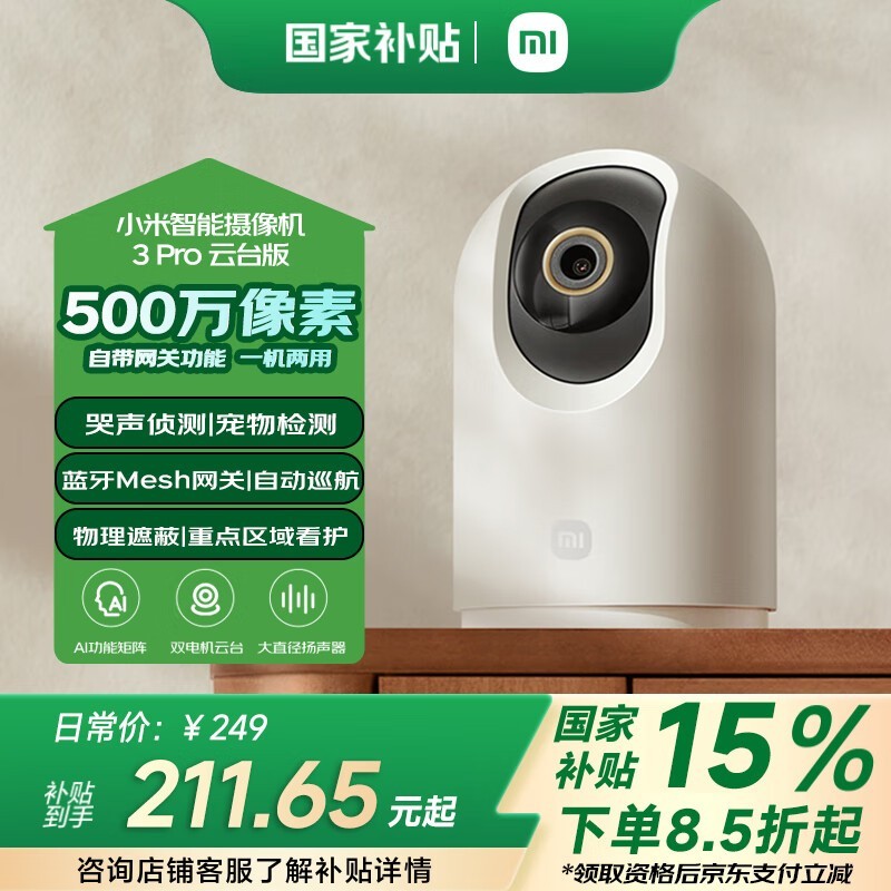 小米Xiaomi智能摄像机3 Pro云台版,3K超清仅189元到手