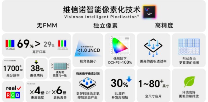 本次会议维信诺展示的亮点之一是自主研发的“颠覆性”创新技术ViP,该技术采用光刻像素方式突破了传统AMOLED技术受制于FMM的工艺瓶颈,使ViP AMOLED产品在寿命、亮度、分辨率等性能指标上有倍数级提升。ViP技术可使像素密度提升至1700ppi以上,配合维信诺Tandem叠层器件技术,较FMM AMOLED可实现6倍的器件寿命或4倍的亮度。此外,在画质、可靠性方面都有较大提升。目前维信诺ViP技术已具备多尺寸应用量产能力,覆盖从智能手表、智能手机到中尺寸笔记本电脑。ViP技术凭借其优越的性能优势,能覆盖小、中、大全尺寸应用性能需求,将全面引领AMOLED+时代。