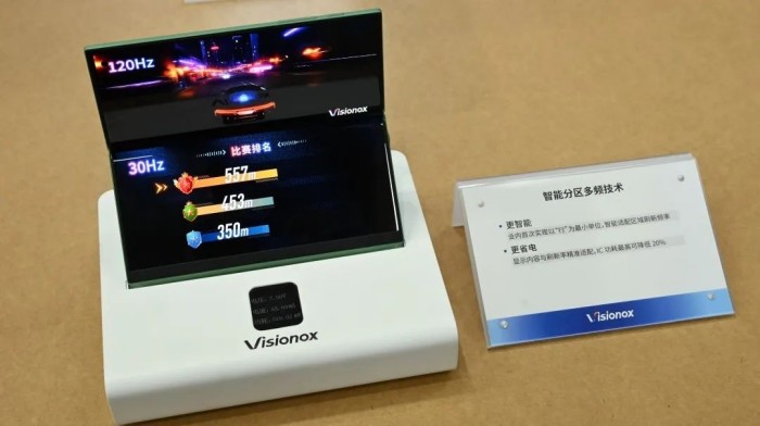随着AMOLED向中尺寸应用持续渗透,且在AI的加持下,电子产品功耗越发成为关注重点。维信诺前瞻技术发展趋势,推出智能分区多频技术。该技术是行业首个以“行”为最小控制单元的刷新率调节方案,实现显示内容与刷新率的精准适配,避免全程高刷造成的功耗浪费,将屏幕驱动IC功耗最高降低20%。