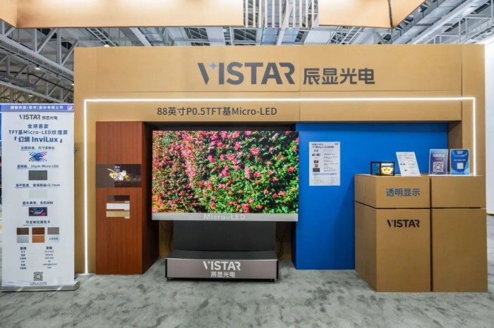 维信诺参股公司辰显光电在展会上重磅发布了全球首款TFT基Micro-LED纹理屏——「幻境InviLux」。这款产品采用了微纳纹理覆层技术,能够呈现木纹、大理石纹、金属纹等多种纹理效果,并支持客制化设计,使其不仅是一块屏幕,更可以化身为墙面、家具或艺术装置,完美融入各类场景。与传统屏幕在息屏状态下的“黑块”视觉割裂感不同,「幻境InviLux」在开机时呈现鲜亮画面,关机时则与背景无缝融合,实现了功能与美学的完美平衡。