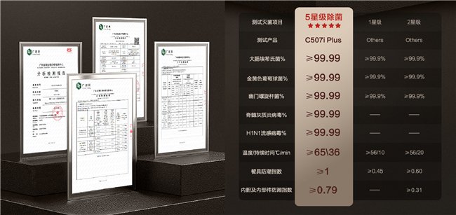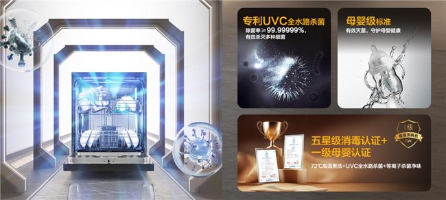 传统洗碗机在清洁过程中往往难以彻底杀灭耐高温菌种,且存在二次污染的风险。为解决这一问题,海信零菌洗碗机WQ16-C507iPlus内部搭载了UVC全水路杀菌、巴氏高温杀菌和高温离子烘干三重灭菌科技,在洗、消、烘、存全链路对餐具进行消杀,杀菌率高达99.99999%,达到7LOG级国际健康标准,并获得五星级消毒认证。