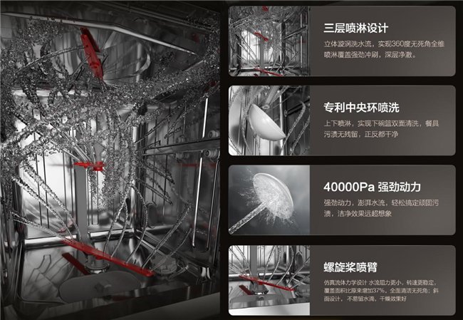 面对蒸蛋碗残留、杯底茶渍等顽固污渍,以及深口锅具、异形餐具的清洁死角,海信零菌洗碗机WQ16-C507iPlus内部搭载了日本尼徳科40000Pa强劲电机,与普通电机相比,具备持久耐用、更低能效,更静音的优势,搭配六翼螺旋桨喷淋系统,通过三层大喷臂和35个万向喷孔,形成立体漩涡水流,覆盖面积增加37%,水压提升25%,轻松瓦解各类污渍,实现全面清洁覆盖。专利中央环喷加强洗技术针对锅底、碗底进行双面强洗,确保无死角清洁。而智能分层洗涤功能则根据餐具量自动调节水流,少量餐具单层洗涤,可节水15%,将环保与高效完美结合,为用户提供更智能、更便捷的清洁体验。