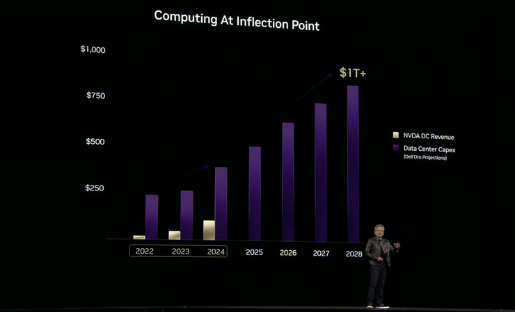 然后黄仁勋大秀成绩单,他表示,2024年美国前四云厂总计采购130万颗Hopper架构芯片,2025年这一数据飙升至360万颗Blackwell GPU。