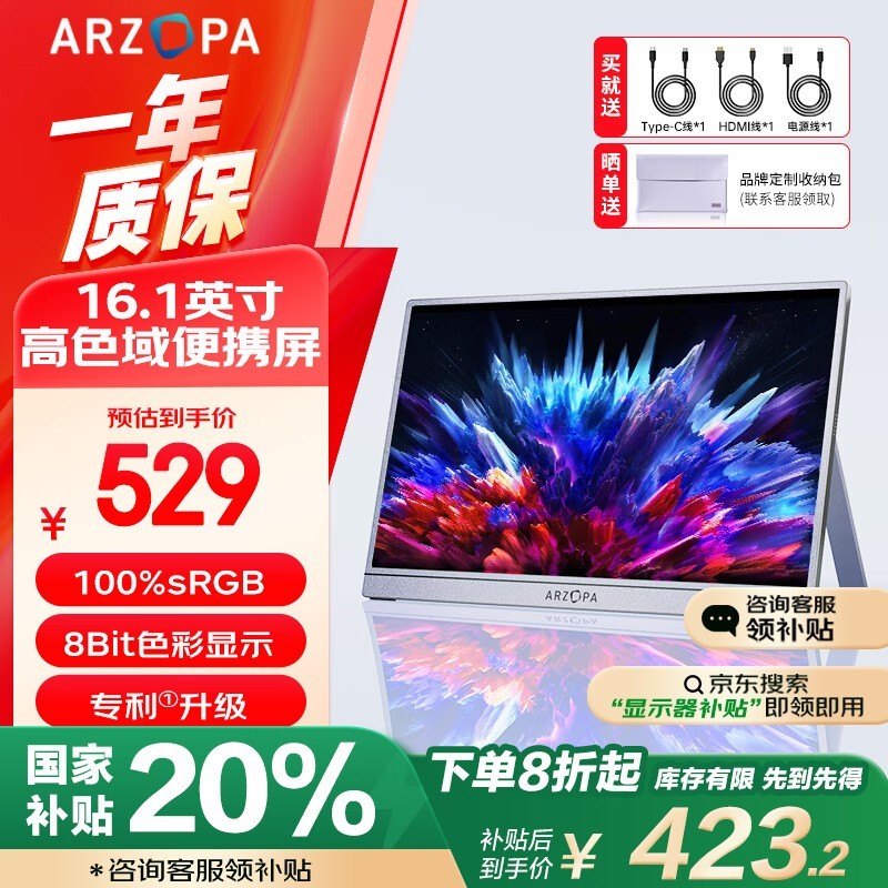 艾卓帕ARZOPA显示器16.1英寸便携屏近期好价仅388元