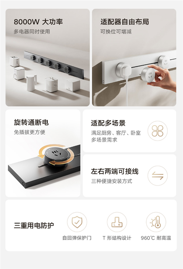 这款创新插座提供50cm、75cm、100cm三种套装版本,满足不同场景需求。其轨道可承载高达8000W功率,单个适配器支持2500W,能够同时为多台大功率电器供电,显著提升家庭用电的灵活性和便利性。