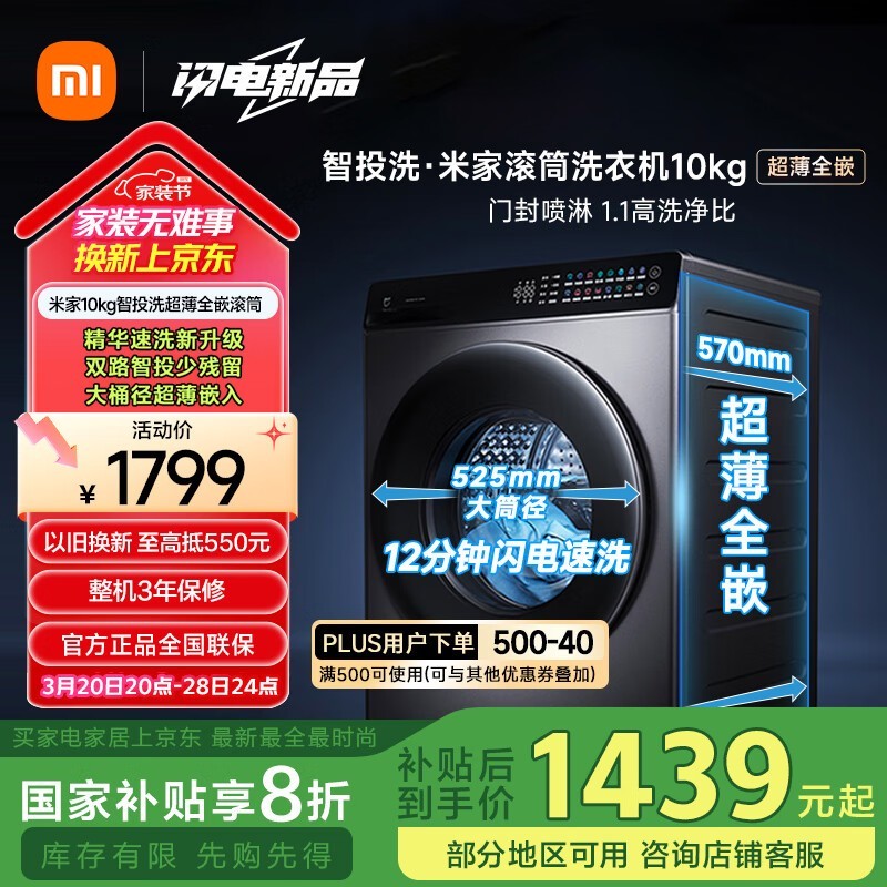 米家MIJIA洗衣机10公斤大容量促销到手价1401元