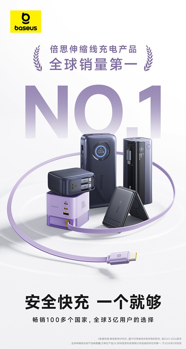 今年2月,市场研究分析公司弗若斯特沙利文(Frost & Sullivan)公布了一组数据,基于对全球充电产品市场的研究,按2021~2024各年全球伸缩线充电产品市场各品牌线上线下渠道全渠道销量计,倍思连续四年位列第一,获得「2021~2024年伸缩线充电产品全球销量第一」的认证。
