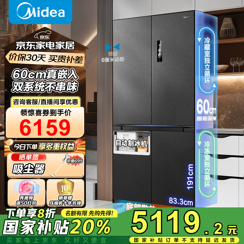 美的M60系列539十字四开门双系统冰箱大促特惠