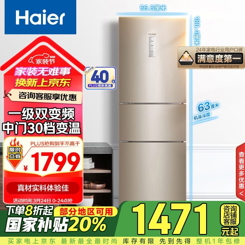 海尔BCD-223WDPT风冷三门冰箱223L金色促销