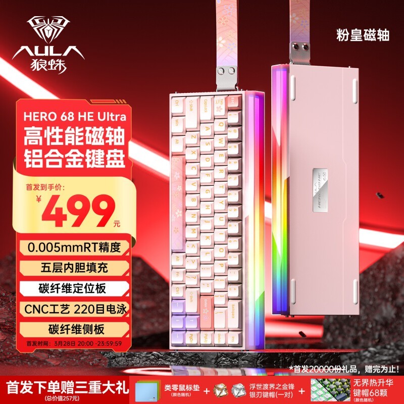 狼蛛HERO68HE铝坨坨磁轴键盘电泳粉色碳板精致优雅手感出众