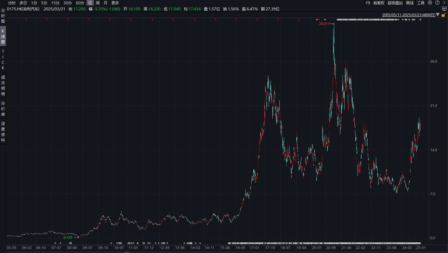 截至2025年3月21日,吉利汽车收盘价为17.2港元/股,市盈率(TTM)约9.65倍,总市值约1733亿港元。