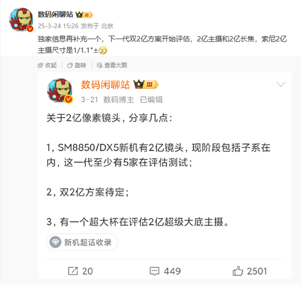 【CNMO科技消息】3月24日,数码闲聊站透露,某手机厂商已经开始评估双2亿像素镜头方案。
