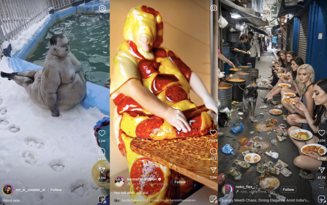 该账号其他内容|图源:Instagram而这类视频和其他 AI 短视频不同之处在于:在画面上极度诡谲和猎奇。它已经跳出了 AI 和现实擦边的恐怖谷,而是在普通的生活场景里,突然让人畸变,长出异常的肢体,变成不可名状的怪物,